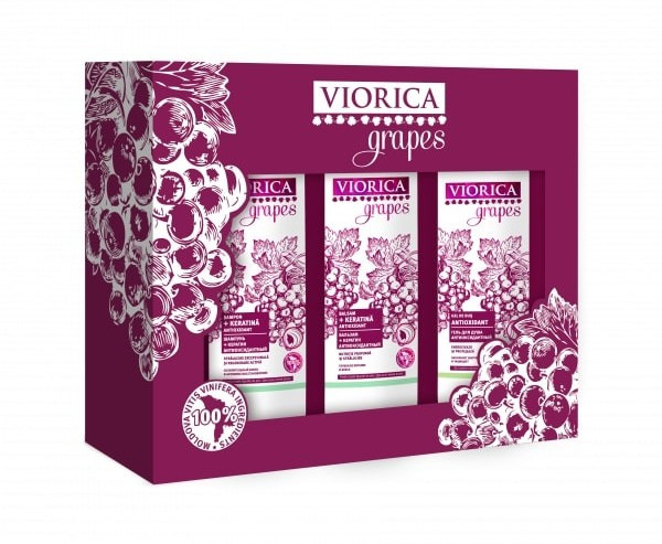 Descrierea "Set nr.4 VIORICA Grapes Ingrijire par si corp Sampon antiox.+keratina Viorica Grapes 300ml (R) Gel- dus antioxidant Viorica Grapes 300 ml ® Balsam ant