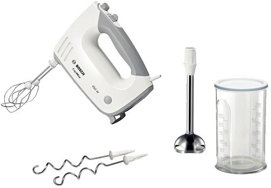 Миксер Bosch MFQ36470, 500W power output, 5 speed levels plus pulse level, 2x dough hook, 2x beater, stick mixer attachment, vanilla/silver