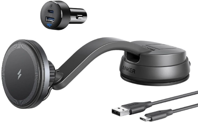 USB Car Charger - Anker 613 Magnetic Wireless Charger MagGo, charge for the iPhone 13 and 12 series, 2-port USB car charger, 5 ft (1.5 m) USB-C to USB-A charging cable, 4 cable clips (self-adhesive), mounting pad (3M), black