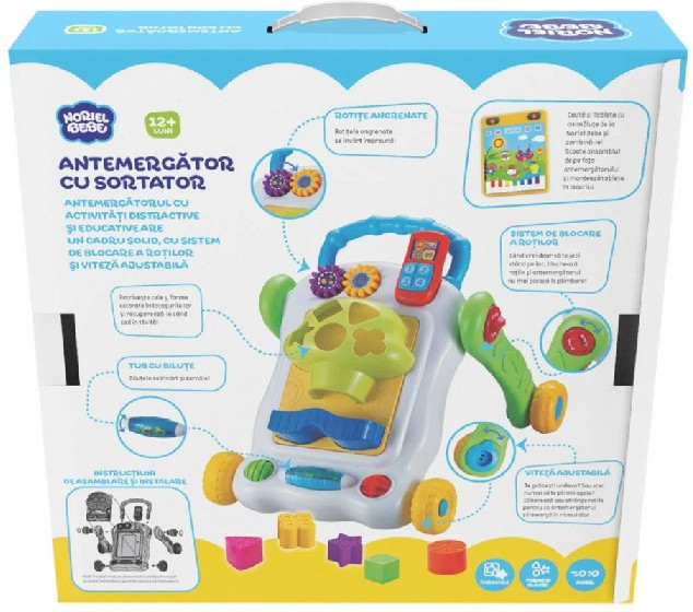 Noriel Bebe "Antemergator" Antemergatorul cu activitati distractive si educative are un cadru solid, cu sistem de blocare al rotilor si viteza ajustabila, pentru ca micutul sa faca primii pasi in deplina siguranta, pornind sa descopere lumea cu toata bucuria! Cand vrei doar sa te joci stand pe loc, blocheaza rotile si premergatorul nu mai pleaca la plimbare! Bilutele se invart si zornaie! Incurajeaza dezvoltarea urmatoarelor abilitati: coordonare, indemanare, logica, musculatura, simturi, echilibru, spirit de observatie. Varsta recomandata: 12 luni +