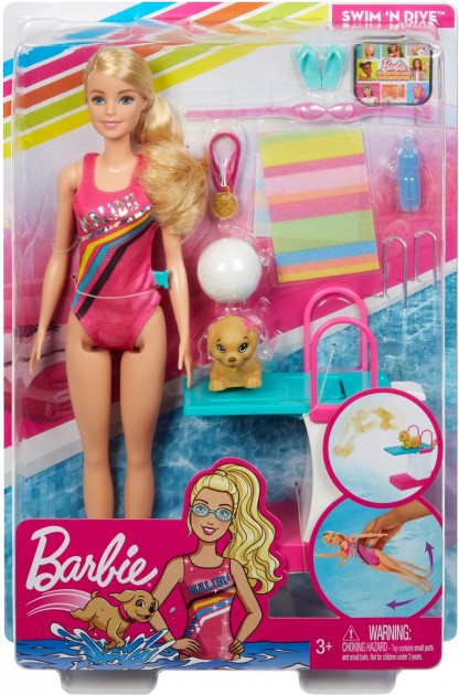Существует множество возможностей для игры: наденьте на куклу Barbie солнцезащитные очки - и вот она уже готова к грациозным прыжкам с трамплина, или возьмите мяч и поиграйте в водное поло.