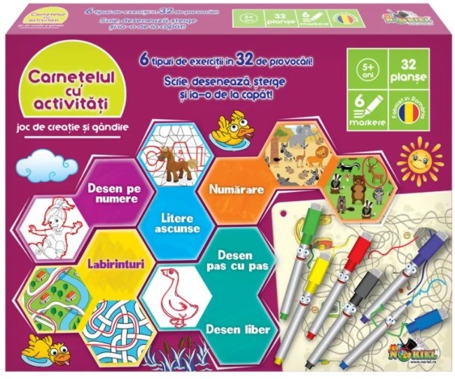 Noriel Креативно-мыслящая игра «Занятие» Пишите, рисуйте и начинайте заново! Интеллект, сноровка, наблюдательность, креативность и много игры - все это мы собрали в тетрадь с 32 таблицами с художественной и образовательной деятельностью. Используйте 6 цветных маркеров, чтобы научиться рисовать, читать, считать и решать задачи. А если вы ошибетесь или захотите повторить попытку в другой раз, все, что вам нужно сделать, это протереть все губкой! 6 видов упражнений в 32 заданиях! - Опираясь на числа - Лабиринты - Скрытые буквы - Подсчет - Пошаговый рисунок В упаковке: 32 иллюстрированных рисунка, 6 маркеров разного цвета с губкой, 1 зажим для удержания рисунков. Рекомендуемый возраст: 5 лет +
