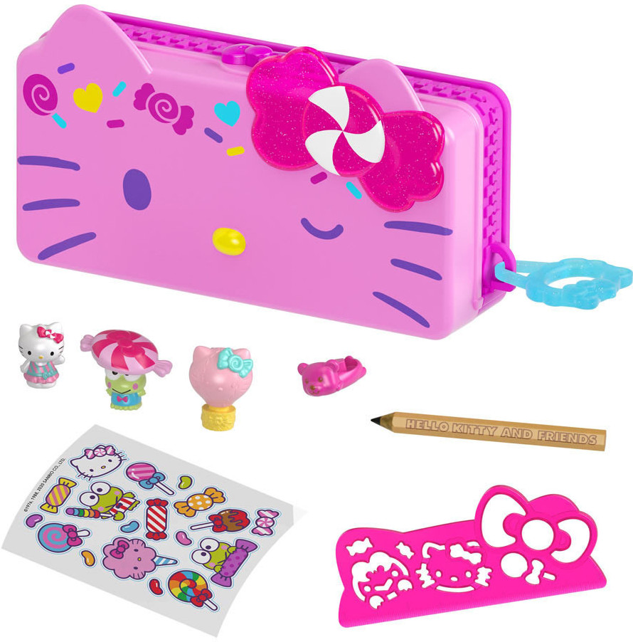 Hello Kitty Hабор "Волшебный пенал" (в асс.) В волшебном пенале Hello Kitty в стиле карнавала или пляжной вечеринки ты найдешь множество сюрпризов и стильных деталей, таких как карандаш и 2 фигурки-наконечника на него, резинку, лист с наклейками и сказочный трафарет! Внутри каждого пенала тебя ждет интересный игровой набор с гамаком-качалкой, водной горкой, колесом обозрения и другими неожиданностями! Выдумывай захватывающие сюжеты игры с любимыми героями, наслаждайся рисованием с трафаретом и обклеивай пенал яркими наклейками! Подготовься к школьному веселью с пеналами Hello Kitty! Рекомендовано для детей от 4-x лет.