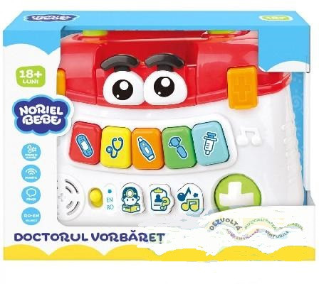 Noriel Bebe "Doctorul vorbaret" Trusa medicala bilingva (romana – engleza) care iti vorbeste, te invata si iti canta! Este compusa din: - 3 moduri de joc (invatare, evaluare, muzica); - 2 placute cu activitati educative; - 5 instrumente medicale (stetoscop, bandaj, seringa, termometru, otoscop). Alege o placuta, monteaz-o in capacul cutiei si selecteaza un mod. Doctorul vorbaret iti explica la ce se folosesc instrumentele, iti pune intrebari si iti canta melodii! Functioneaza cu 2 x baterii tip AA de 1,5V (nu sunt incluse). Varsta recomandata: 18 luni +