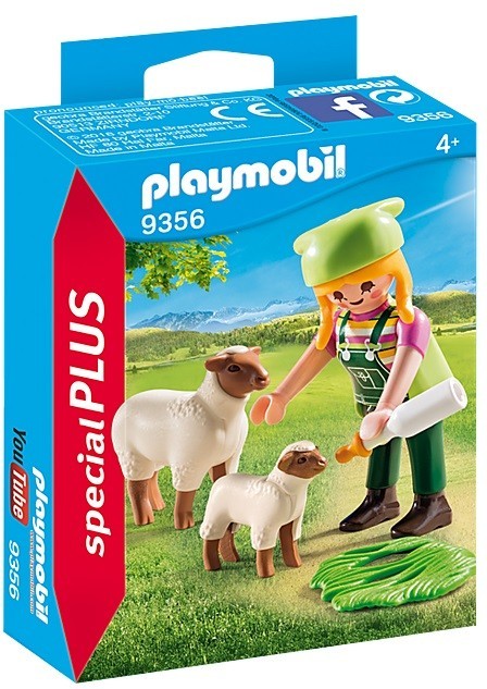 Фигурки: 1 женщина Животные: 1 овца, 1 ягненок Принадлежности: 1 зеленый корм, 1 бутылка молока, 1 платок