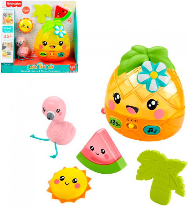 FP Jucarie "Ananasul muzical ?i prietenii sai" (eng) Jucaria reproduce peste 35 de cantece, sunete, melodii ?i fraze in limba engleza. Punand prieteni tropicali in ananasul jucau?, copilul va auzi sunete amuzante ?i melodii incantatoare ?i va vedea lumini stralucitoare. Vrei mai multa distrac?ie? Apasa?i butoanele de pe ananas pentru a auzi mai multa muzica tropicala ?i pentru a activa melodii ?i fraze de inva?are despre culori, numere ?i forme. Setul include trei zornaitoare: sub forma de soare, o bucata de pepene verde ?i un flamingo cu picioare moi din dantela. Varsta recomandata: de la 6 luni