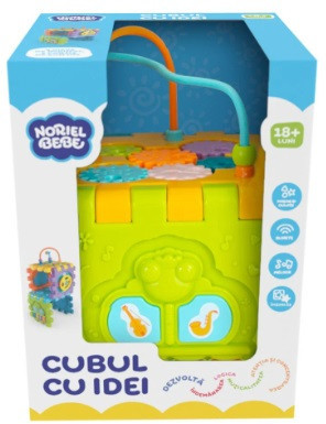 Noriel Bebe "Cubul cu idei" Un cub plin de idei pregatite pentru tine: te invata sa "vorbesti la telefon", te ajuta sa asculti si sa compui muzica, iti da forme de sortat, te provoaca sa pui in miscare un intreg angrenaj, iti pastreaza jucariile in compartimentul lui secret si te invata sa conduci! Ansamblu de joaca cu 6 piese de imbinat, 4 forme de sortat si 6 activitati captivante. Functioneaza cu 3 baterii tip AAA de 1,5V (nu sunt incluse). Varsta recomandata: 18 luni +