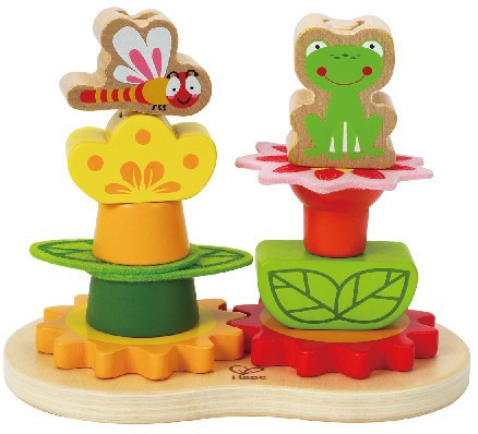К основе игрушки закреплены два штырька, на которые малыш должен нанизать фигурки, чтобы получилось два необычных цветочка.