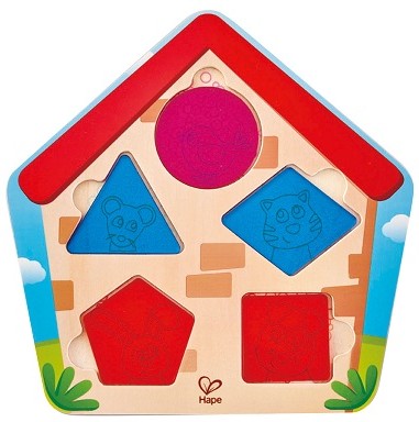 Пазлы состоят из небольшой деревянной основы-домика, на которой есть отверстия разной формы.