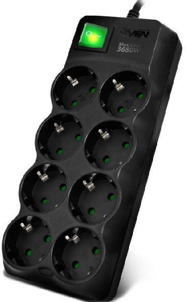 Surge Protector 8 Sockets, 3.0m, Sven SF-08E-16, Black, flame-retardant material