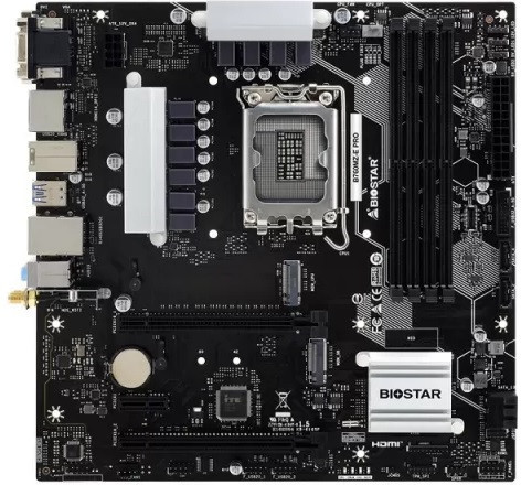 Материнская плата BIOSTAR B760MZE PRO, Socket 1700, Intel® B760 (13/12th Gen CPU), CPU graphics, VGA, DVI, HDMI, DP, Dual 4xDDR5-6000, 2xPCIe X16 4.0, 4xSATA3, 2xM.2 4.0, RAID, 1xM.2 E-key for Wi-Fi, 1xPCIe X1, ALC897 HDA, 2.5GbE LAN, 1xUSB-C 3.2Gen2, 5xUSB3.2, VIVID LED