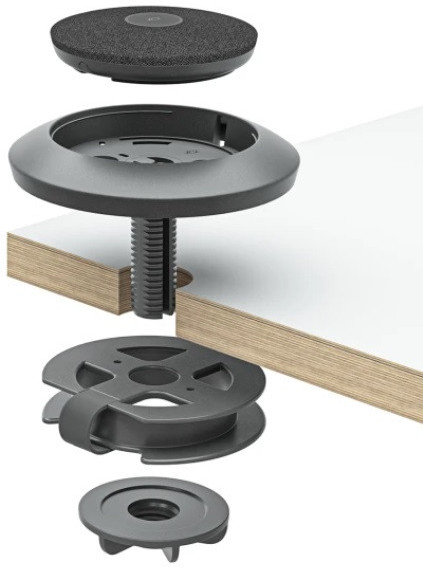 Крепление Mic Pod фиксирует микрофоны и прокладывает кабели через втулки диаметром 25–65 мм и адаптируется к столам толщиной до 50 мм.