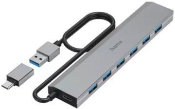 Hama 200137 USB Hub, 7 Ports, USB 3.2 Gen 1, 5 Gbit/s, incl. USB-C Adapter and PSU