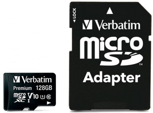 - 128GB microSD Class10 A1 UHS-I + SD adapter Verbatim Premium microSDXC, 600x, Up to: 90MB/s128GB microSD Class10 A1 UHS-I + SD adapter Verbatim Premium microSDXC, 600x, Up to: 90MB/s Класс скорости Class 10 Объём памяти, Гб 128