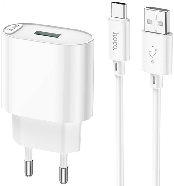 USB Charger HOCO C109A Safe Charger Set, Single port, 1 x USB, USB to USB-C 1m cable included, USB: 18W, up to QC3.0, White