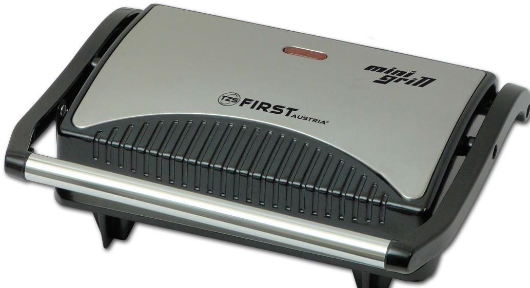 Крышка и ручка контактного гриля First FA 5343-1 сделаны из нержавеющей стали, которая хорошо сочетается с черным, жаропрочным корпусом. В целом, модели характерен стильный и современный дизайн.