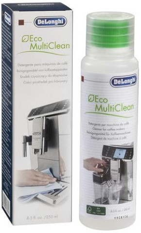 Чистящее средство DeLonghi DLSC550 эффективно очищает детали кофемашины и капучинатора для молока. Средство растворяет молочные частички и предотвращает засорение каналов подачи, а также появление неприятного запаха. Безопасная формула не портит покрытие техники даже при частом применении. Объем флакона составляет 250 мл, его хватает для проведения 25 очищающих процедур. Регулярное применение продлевает срок службы техники. Для очистки в контейнер для молока залейте 10 мл средства и 90 мл воды, далее следует нажать кнопку подачи. После рекомендуется повторить процедуру уже с чистой водой.