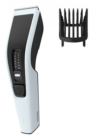 , mains operation/rechargeable battery operation (operating time 75 minutes, charging time 8 hour), 13 cutting lengths (0.5-23mm in 2mm steps), cutting width 41mm, comb attachment, self-oiling, automatic voltage adjustment
