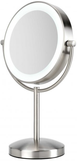 Дополнительные характеристики Двустороннее: зеркало с 8-ми кратным увеличением, Вращающаяся рамка, Матовое металлическое покрытие, Светодиодная подсветка по окружности с мягким теплым светом (имитирующая нормальное комнатное освещение)