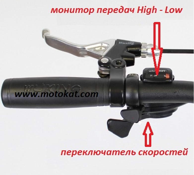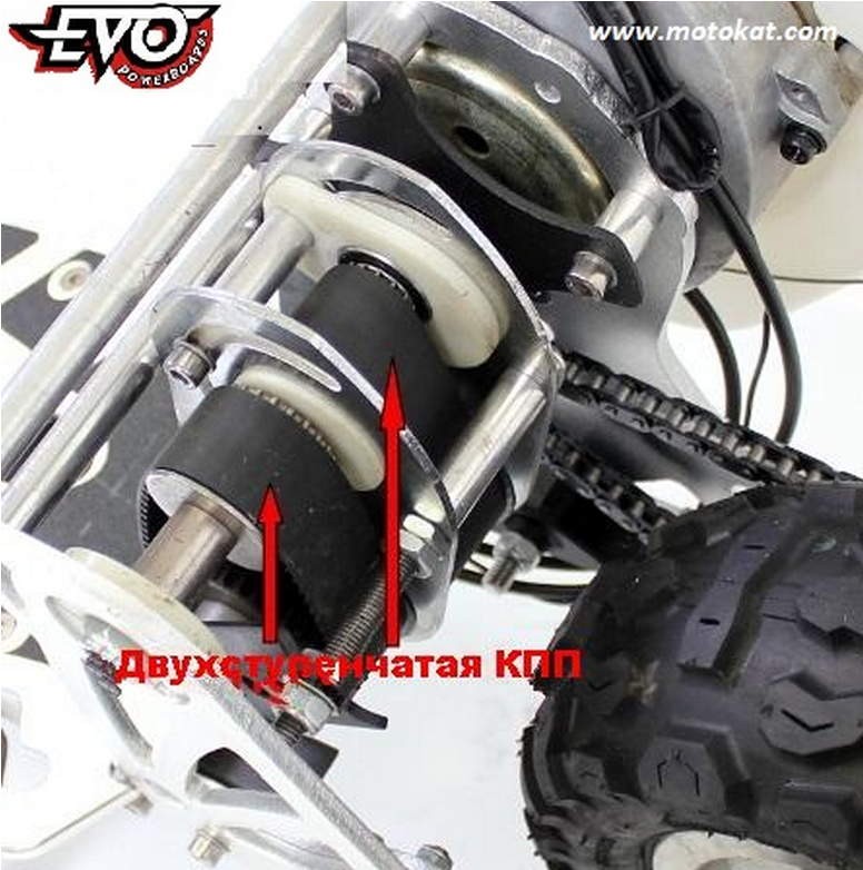 Переключение передач осуществляется натяжением рычага скоростей (как на велосипеде), тем самым приводится в действие второй ремень в коробке, который вращает шестерню большего диаметра.
