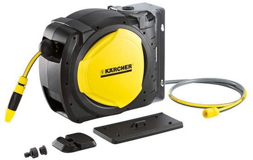 Автоматическая катушка для шланга. Плоский кронштейн для крепления катушки на стене. Автоматическое сматывание и распределение шланга. В комплекте шланг 1/2" 20 метров.+ рапылитель с коннекторами и штуцером для крана 3/4 на 1/2.