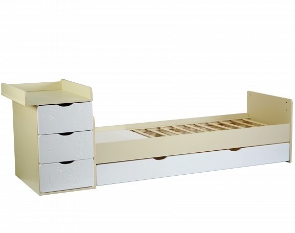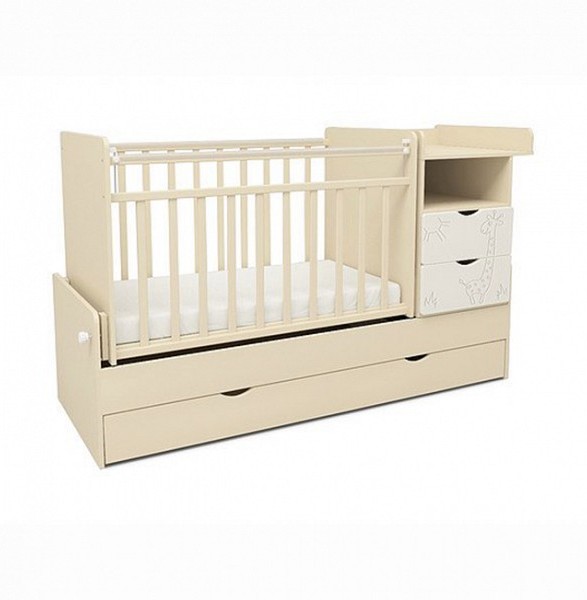 550039-1 Кровать детская СКВ-5 Жираф, опуск.бок., маятник, полка, 3 ящика, бежевый + белый Размер ложа 1200х600 мм.