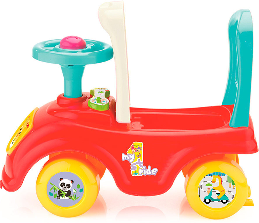 Толокар имеет подвижные колеса и руль, а еще сиденье поднимается, и под ним можно хранить любимые игрушки. Удобная спинка выполняет еще одну функцию — ребенок может держаться за нее и учиться ходить.