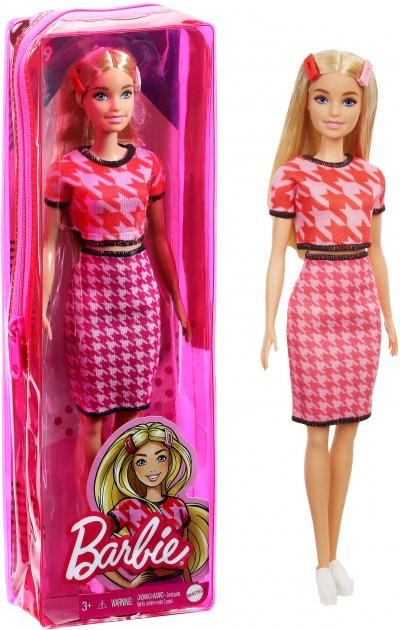 Barbie Кукла "Модница" в розовом костюме В комплекте кукла Barbie, которая одета в костюм (верх-низ) с кофтой с короткими рукавами и юбку по колено с принтом в ломаную клетку, и белые кроссовки с открытой пяткой. Две заколки украшают прическу куклы и делают ее образ милее. В виниловой упаковке на змейке можно хранить куклы или одежду и аксессуары Barbie. Рекомендуемый возраст: от 3-x лет
