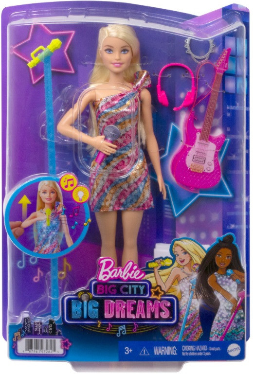 Barbie Papu?a muzicala "Ritmuri Malibu" Daca duci microfonul la gura lui Barbie, muzica va canta, rochia va straluci, iar papu?a va canta una dintre cele doua melodii originale ale sale. Plonjeaza-te in lumea vedetelor pop cu papu?a Barbie Malibu Beats in aspectul ei de scena, bazat pe desenul animat "Big City, Big Dreams”! Varsta recomandata: de la 3 ani