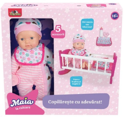 In fiecare seara, Maia asteapta cuminte in patucul ei sa o invele?ti, sa ii dai biberonul ?i sa ii spui o poveste de culcare. Poti s-o legeni in patucul ei pana adoarme sau sa o iei cu tine in pat. Are chiar ?i o pernu?a ?i o paturica pe masura ei! Dupa ce s-a terminat pove?tea, da-i suzeta si spune-i „Noapte buna”, iar maine sunte?i din nou gata de joaca!