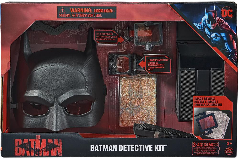 Spin Master "Бэтмен набор детектива" Защитите Готэм-сити с детективным набором Бэтмена! В этом интерактивном детективном наборе для ролевых игр есть все, что вам нужно, чтобы стать величайшим детективом в Готэм-сити, включая маску Бэтмена, пояс с инструментами, чемодан детектива, карточки-подсказки и многое другое! Храните свои удостоверения личности в надежном футляре. Прикрепите его к ремню, наденьте маску Бэтмена, и все готово! Используйте свое воображение и воссоздайте свои любимые моменты из фильма о Бэтмене. Комплектация: 1 маска Бэтмена, 1 пояс с инструментами, 1 чемоданчик детектива, 1 бэтаранг, 1 красная линза с подсветкой, 1 лупа, 4 карточки с уликами. Работает от 3 батареек LR44 (входят в комплект). Рекомендуемый возраст: 3 года +