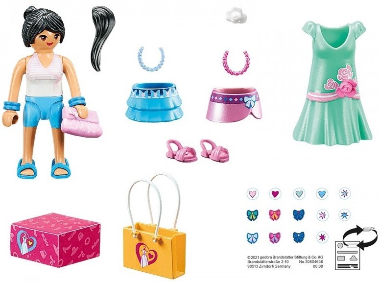 Любители шопинга, присоединяйтесь к нашей моднице и отправляйтесь за новыми нарядами. Подумайте, как скомпоновать отдельные предметы гардероба и подобрать аксессуары к каждому из них. Вам представится возможность украсить наряды стикерами в форме бантиков, сердечек и звездочек. Вы сможете также менять прическу девушке с помощью шиньона. В наборе: фигурка девушки. Руки, ноги и голова подвижны одежда: платье, две юбки, две пары шлепанец шиньон и заколка сумка-клатч, пакет для покупок, коробка два ожерелья стикеры для украшения одежды