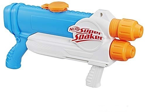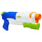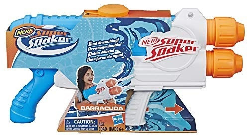 Nerf Super Soaker Barracuda состоит из голубых, белых и оранжевых деталей, сбоку принтованная фирменная надпись.