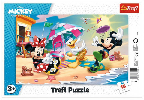 Trefl Puzzles - 15 Frame - Play on the beach Пазлы состоят из 15 элементов с изображением любимого Микки Мауса и его друзей во время веселой забавы на пляже. Элементы помещены в декоративную графическую рамку, которая образует вместе с изображением единое целое. Кроме этого, данная рамка помогает маленьким деткам соб