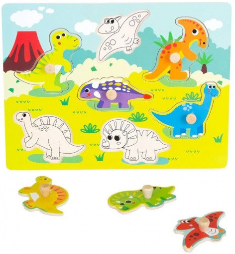 Noriel Bebe "Puzzle cu Dinozauri" Potriveste dinozaurii din lemn in formele potrivite, folosind manerele incorporate care fac piesele usor de apucat pentru cei mici. Exerseaza logica si indemanarea cu acest puzzle cu 7 dinozauri! Setul contine: - plansa din lemn; - 7 forme din lemn cu maner. Varsta recomandata: 12 luni +