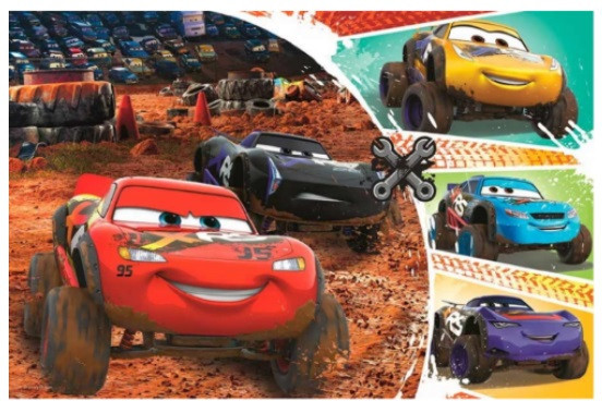 Пазлы на 60 элементов с изображением в виде коллажа Молнии Маккуин и его друзей - любимых персонажей популярного анимационного фильма Уолта Диснея "Тачки-3". В сложенном виде размер картинки составляет 22х33 см. Высокое качество, насыщенность цветов и безопасность при собирании пазлов обеспечивает специальный каландрированный картон, который отражает свет и покрыт экологическими красками.
