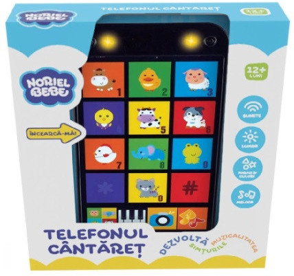 Alo, cine-i acolo? E telefonul cantare?! ?tie sa cante, sa lumineze, sa faca sunete de animale ?i multe altele. Dezvolta sim?urile ?i muzicaliatea. Func?ioneaza cu 2 baterii tip AAA (incluse).