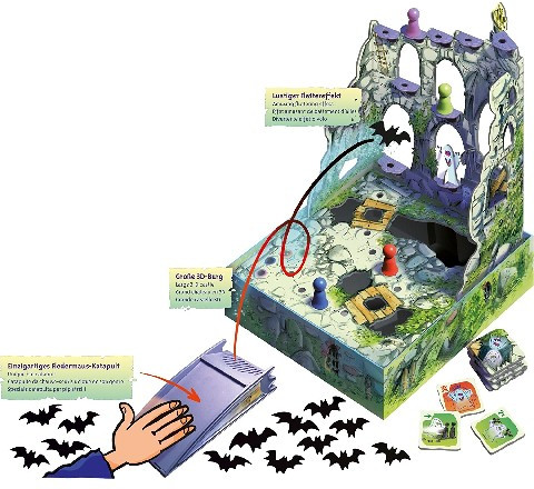 В ходе игры участникам предстоит с помощью катапульты запускать фигурки летучих мышей в замок.