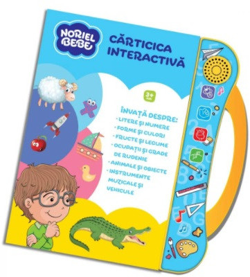 Noriel Bebe "Carticica interactiva" Carticica interactiva dezvolta cunostintele, creativitatea si spiritul de observatie. Apasa butoanele, afla cum se numesc lucrurile si raspunde la intrebari! Prin joaca, vei invata despre o multime de lucruri: litere, numere, forme, culori, fructe si legume, ocupatii, grade de rudenie, animale, obiecte, instrumente muzicale si vehicule. Jucaria vorbeste si canta in limba romana. Functioneaza cu 3 baterii tip AA (nu sunt incluse). Varsta recomandata: 3 ani +