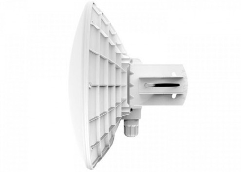 Двухканальный радиомодуль RBDynaDishG-5HacD работает в диапазоне 5ГГц и поддерживает новейший стандарт беспроводной передачи данных 802.11 AC. В точку доступа встроена антенна параболического типа с углом излучения 8О и усилением в 23Дби. Устройство имеет на борту один гигабитный порт Ethernet. Все это, вместе с новым производительным процессором 720МГц от фирмы Qualcomm и 128 МБ оперативной памяти, делают эту точку идеальной для построения недорогих соединений PtP на большие расстояния.