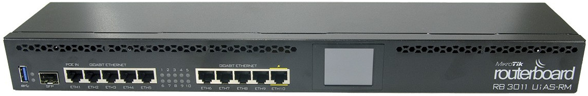 Mikrotik RouterBOARD 3011UiAS (RB3011UiAS-RM), Dual core 1.4GHz ARM CPU, 1GB RAM, 10xGbit LAN, 1xSFP port, RouterOS L5, 1U rackmount case, LCD panel