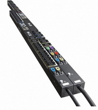 Блок распределения питания с двумя однополюсными переключателями от компании Eaton. Модель EMIB05 имеет внешний интерфейс управления и интерфейсы для подключения дополнительных распределяющих блоков. Прибор рассчитан на мощность до 7 кВт и ток, значение которого не превышает 32 А. В наличии 20 розеток С13 и 4 розетки типа С19.
