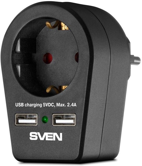 Surge Protector 1 Sockets, Sven SF-01U, 2 USB ports charging (2.4A), Black