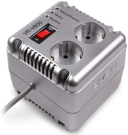 SVEN VR-V600, 200W, Automatic Voltage Regulator, 2x Schuko outlets, Input voltage: 184-285V, Output voltage: 230V ± 10%, diod indicators on the front panel, plastic body, silver