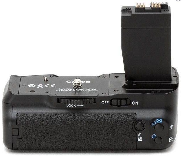 Батарейный блок BG-E8 для фотоаппаратов Canon 550D. Повышает скорость съёмки и увеличивает время автономной работы. Эргономичная конструкция рукоятки батарейного блока позволяет более удобно держать фотокамеру при съёмке в вертикальном положении. В качестве источника питания блока используются шесть стандартных батарей типа АА или две специальные аккумуляторные батареи LP-E8. Для удобства съёмки вертикальных кадров, на рукоятке расположены дополнительная спусковая кнопка затвора, кнопка АЕ lock/FE lock, кнопка включения автофокуса, а также диск управления. Имеется встроенный разъём для крепления штатива.