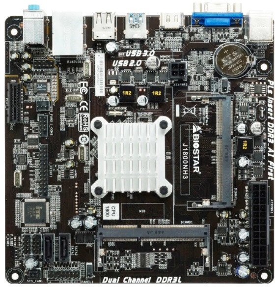 Материнская плата BIOSTAR J1800NH3, MB + CPU onboard: Dual-core Celeron J1800 (2.41-2.58GHz), Dual 2x SO-DIMM DDR3L-1333 (up to 16GB), Intel HD graphics, VGA, HDMI, 2xSATA2, 1xPCIe X1, ALC662 HDA, COM & LPT Header, 1xGbE LAN, 1xUSB3.0, 6xUSB 2.0, Mini-ITX