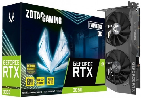 Видеокарта ZOTAC GeForce RTX 3050 Twin Edge 8GB GDDR6, 128bit, 1777/14000Mhz, Ampere, PCIeX16 4.0, Dual Fan / IceStorm 2.0, 1xHDMI, 3xDisplayPort, Active Fan Control/ FREEZE Fan Stop, Cooper Heat pipes, FireStorm, Metal Backplate, Medium Pack
