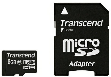 - 8GB MicroSDHC (Class 10), SD adapter, Transcend "TS8GUSDHC10" (R/W:20/16MB/s)