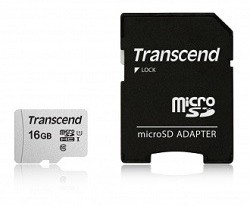 .16GB MicroSD (Class 10) UHS-I (U1) +SD adapter, Transcend "TS16GUSD300S-A" (R/W:95/45MB/s)