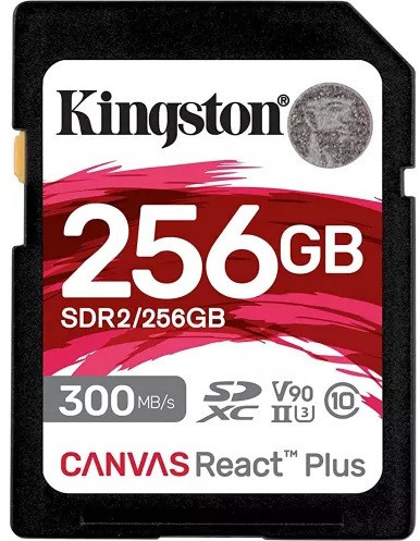 256GB SD Class10 UHS-II U3 (V90) Kingston Canvas React Plus, Ultimate, Read: 300Mb/s, Write: 260Mb/s, Capture 4K/8K Ultra-HD high-speed shots without dropping frames, Ultimate speeds to support professional camera use